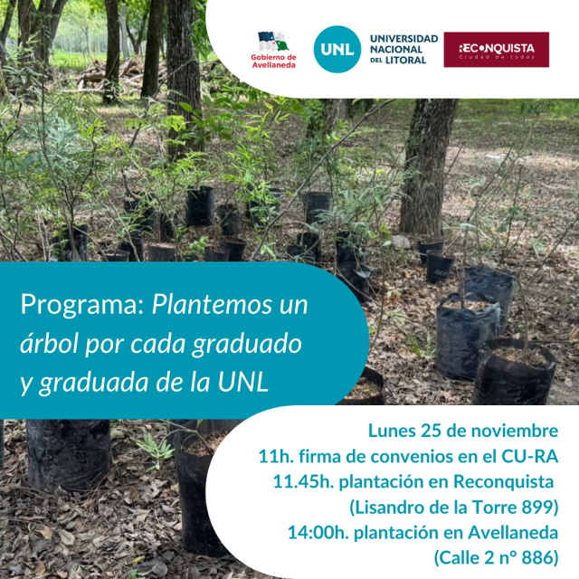 El próximo lunes 25 de noviembre el Rector de la UNL, Enrique Mammarella firmará con los intendentes de Avellaneda, Gonzalo Braidot, y de Reconquista, Enrique Vallejos, los convenios específicos para el desarrollo del programa “Plantemos un árbol por cada graduada y graduado de la UNL” en las mencionadas ciudades. En este caso particular, los especímenes de quebrachos blancos que se plantarán fueron reproducidos a partir de semillas recolectadas en el norte de nuestra provincia.